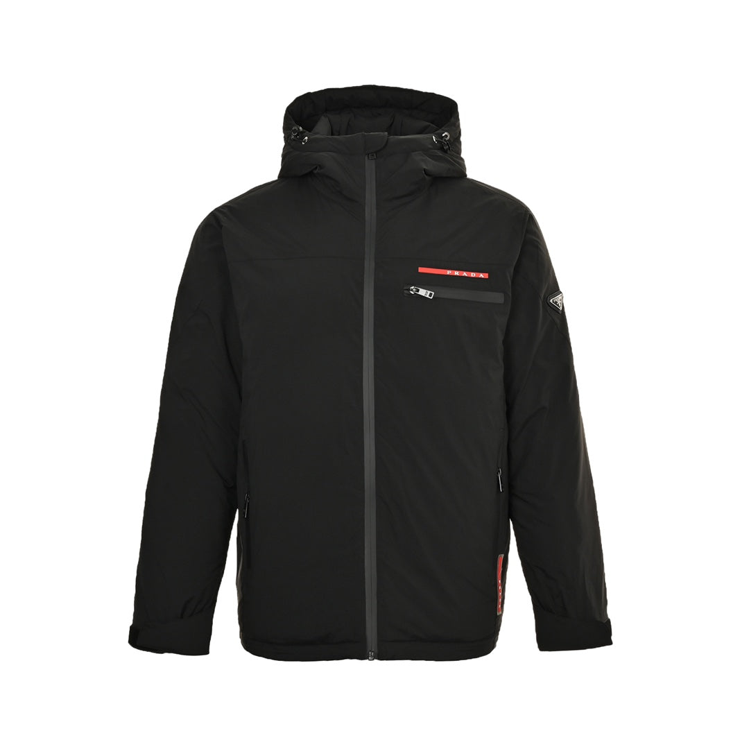 Red label laminated and triangle logo hooded down jacket